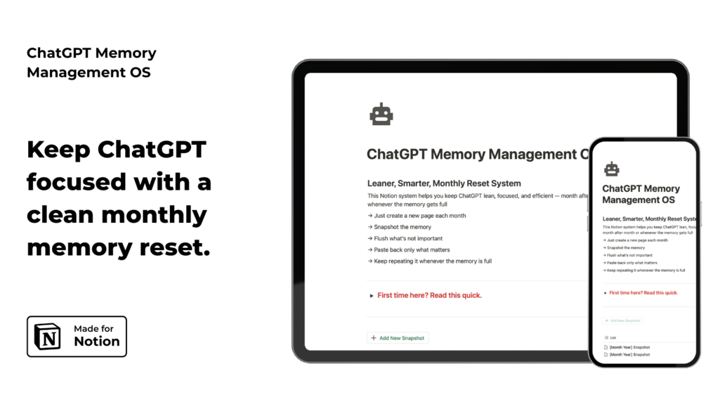 A one-page Notion system to reset, refresh, and control ChatGPT’s memory every month. Stay lean, smart, and context-aware, without losing your flow.