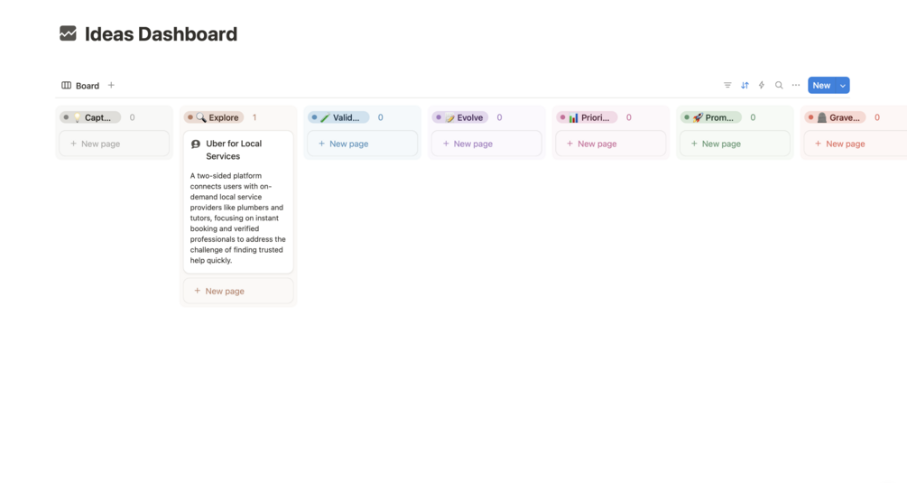 A powerful Notion workspace to capture, explore, and validate your startup or side hustle ideas — so you can stop forgetting ideas and start building the right ones.