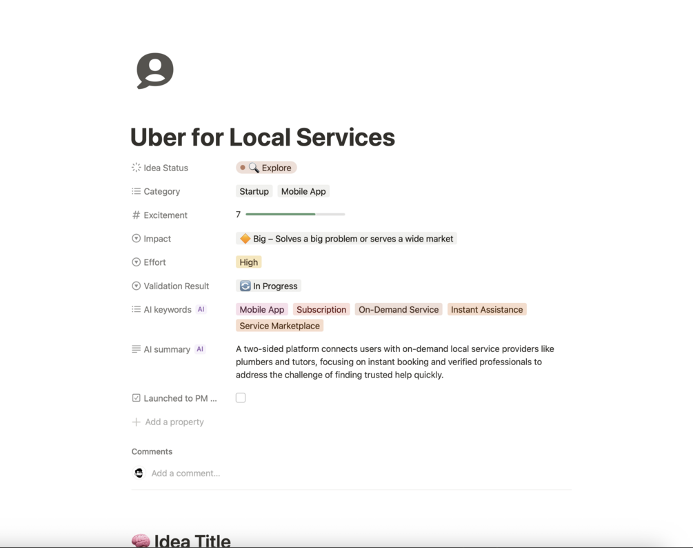 A powerful Notion workspace to capture, explore, and validate your startup or side hustle ideas — so you can stop forgetting ideas and start building the right ones.